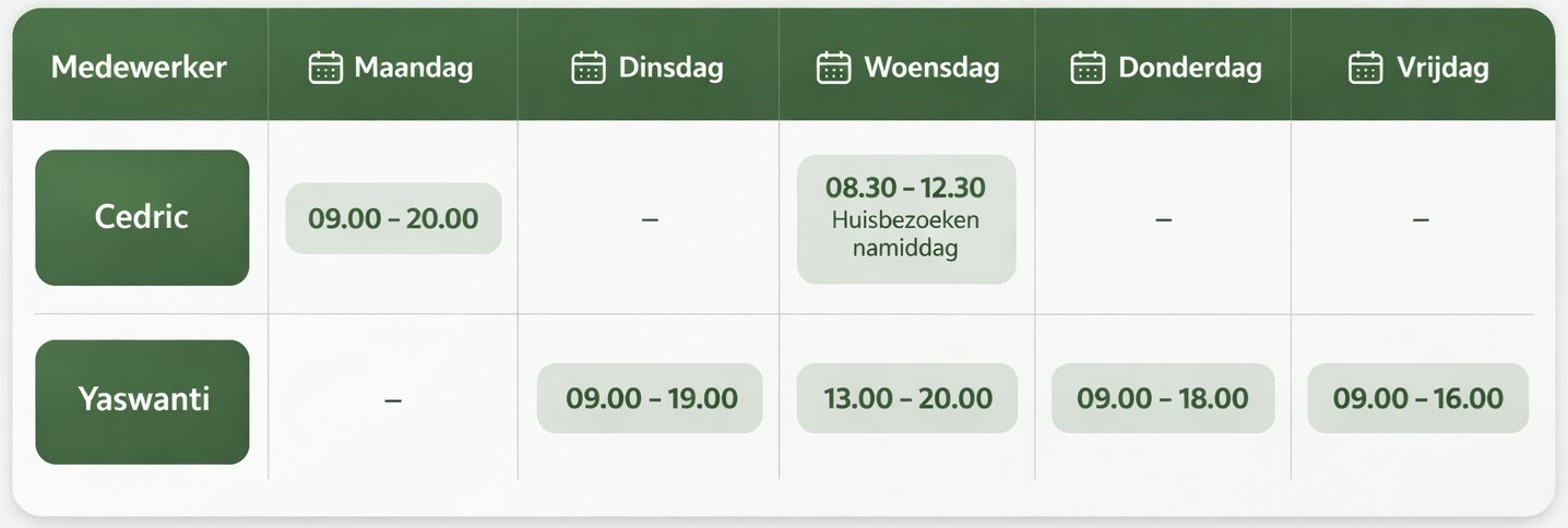 Bekijk hieronder op welke dagen en tijdstippen onze podologen aanwezig zijn.
